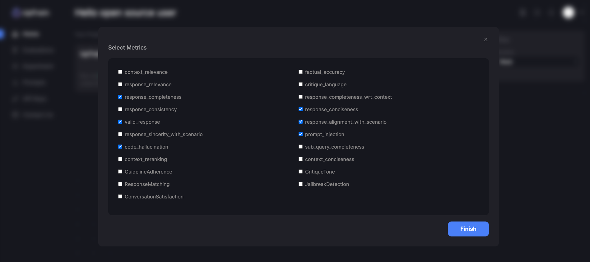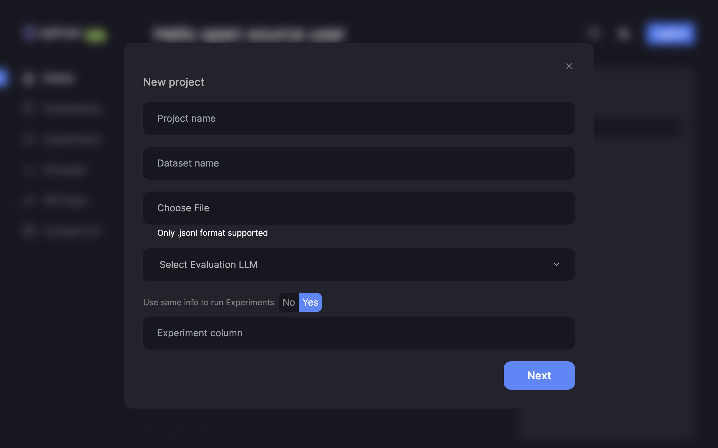 Project name:Create a name for your projectDataset name:Create a name for your datasetChoose File:Upload your Dataset Sample Dataset:Select Evaluation LLM:Select an LLM to run evaluationsUse same info to run Evaluations: Yes If you do not wish to run experiments, you can selectNoand follow the steps hereExperiment column:Enter the column to run experiments on
