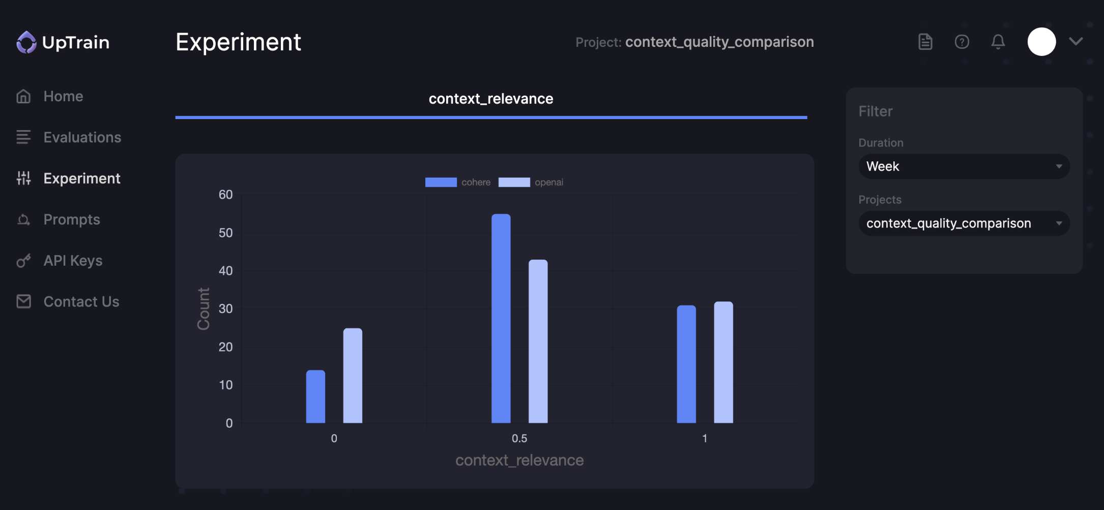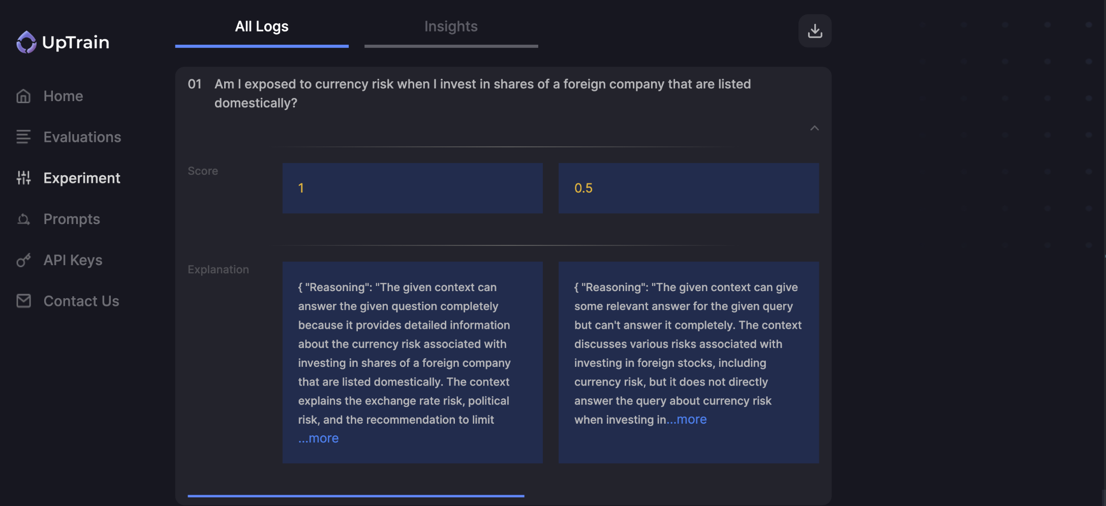 You can experiment with UpTrain on 20+ pre-configured evaluation metrics like:- Context Relevance: Evaluates how relevant the retrieved context is to the question specified.