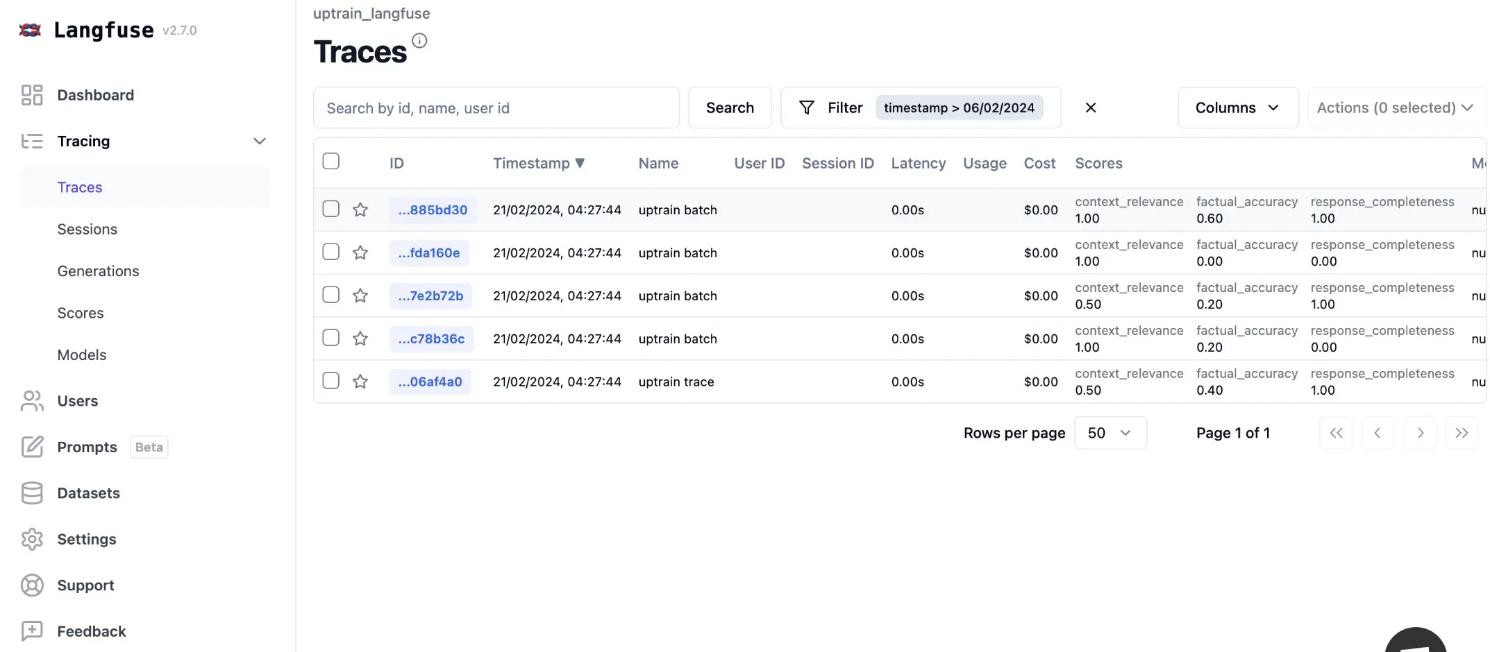 You can use Langfuse in 2 ways:- Score each Trace: This means you will run the evaluations for each trace item. This gives you much better idea since of how each call to your UpTrain pipelines is performing but can be expensive